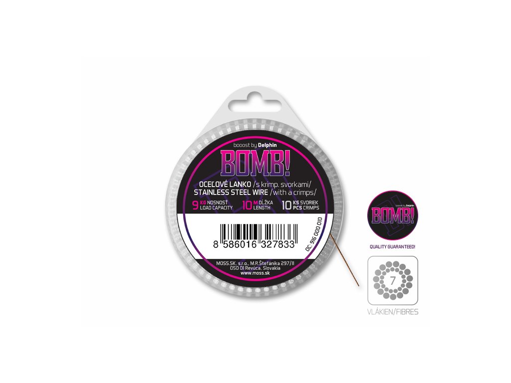 Ocelové lanko přívlačové řady BOMB! od značky Delphin je zhotovené pletením 7 vláken (označovaných také jako 1x7) z nerezové ocele. Vyznačuje se velmi jemným povrchem a vysokou nosností a odolností vůči mechanickému poškození. Lanko je jemné, skvěle se s ním pracuje a umožňuje dokonalou prezentaci vaší nástrahy ve vodě. Toto lanko nepřekousnou ani ty největší vodní predátoři! Lanko BOMB! je balené v neděleném návinu až 10m! Speciální typ balení na uzavřeném kotouči umožňuje vytáhnout jen takovou délku lanka, jakou práv potřebujete. Zbývající lanko se nerozmotává a zůstává navinuté až do nejbližšího použití! Navíc je součástí balení i 10 krimpovacích svorek příslušného rozměru. To umožňuje jednoduché vytváření ocelových návazců různých typů a délek přesně podle vašich potřeb.Doplňkové parametry