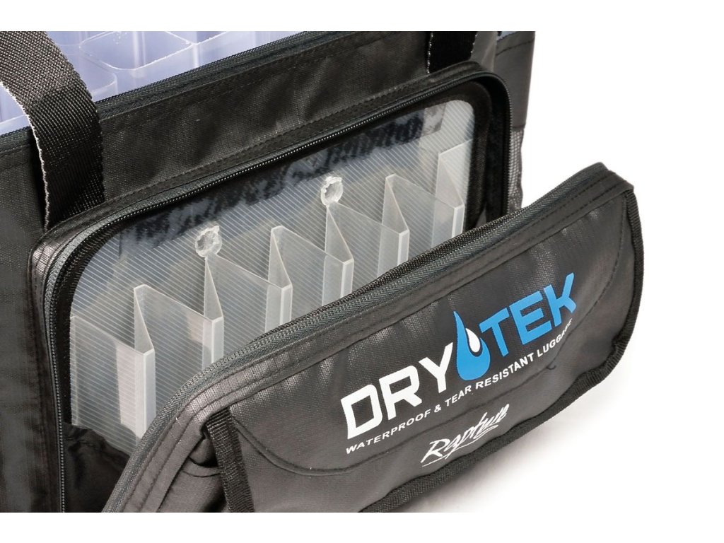 Taška Rapture navržená tak, aby pojala nespočet návnad a drobného příslušenství. Kromě klasických přihrádek na nástrahy jsou po obou stranách plastové boxy s mobilními přihrádkami. Nastavitelný ramenní popruh a pohodlné EVA rukojeti. V horní přihrádce se nachází několik průhledných kapes pro připravené návazce, uzavřené panty, které udržují vnitřek suchý. V hlavní části je mnoho vertikálních přihrádek určených k umístění tvrdých nástrah. V přední kapse pevnější přihrádky pro okamžité použití nástrah.